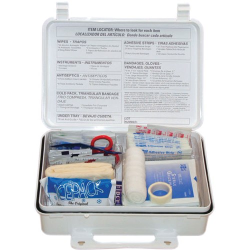 | Includes: | (32) 1" x 3" Adhesive Strips (2) Woven Knuckle Bandages (2) Woven fingertip Bandages (5) 3" Gauze Pads (1) Large Wound Pad (1) 4" Gauze Bandages (1) Triangular Bandages (1) Adhesive Tape (4) Exam Gloves (20) Alcohol Wipes (6) BZK Antiseptic Wipes (3) Sting Relief Wipes (6) First Aid/Burn Cream Packets (6) Triple Antibiotic Ointment Packets (1) Cold Pack (1) Scissors (1) Forceps (1) First Aid Guide |