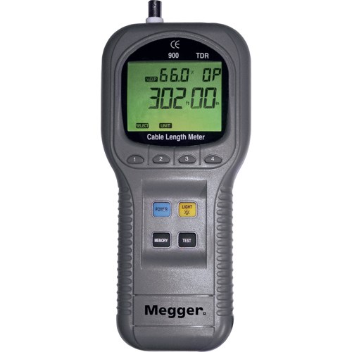 The Megger TDR900 is an advanced instrument capable of measuring cable lengths and finding distance to an open or a short using Time Domain Reflectometry. It offers exceptional features and a range capability normally associated with far more expensive instruments. The measurement range spans from 15 to 10,000 feet, with a minimum resolution of 20 inches. The TDR900 can be used for any cable consisting of at least two insulated metallic elements, one of which may be the shield for the cable. The meter can be closely matched to the cable under test using the menu selection keys. The propagation velocity can be similarly adjusted to match the test cable, thus ensuring an accurate distance measurement. The meter is housed in a rugged ABS enclosure which is dust and weatherproof to IP 42. The unit ships complete with a soft carrying case and an alligator clip adapter. It is powered by 4 AA batteries (included), which are stored in a compartment in the back of the meter.