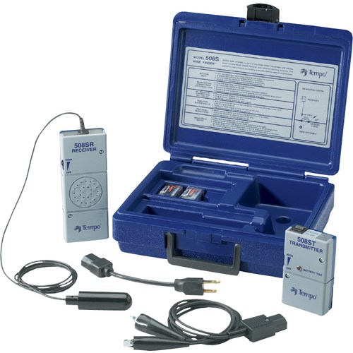 Locate and follow energized (up to 115VAC) or unenergized conductors using this transmitter and receiver set. To operate, simply attach the transmitter leads to the cable, wire, conduit or pipe to be traced. Follow the transmitter's signal by moving the receiver's antenna over the object's suspected path until there is a null. Simply follow the nulls to trace the path up to 1000' from the transmitter. Transmitter signal strength is adjustable to reduce bleed-through in applications involving bundles of wire or cable. May also be used to determine the depth (up to 3') of buried cable, conduit, or pipe. Transmitter and receiver come complete with 9V batteries, instructions, and a 9.5" x 8" x 3" carrying case.